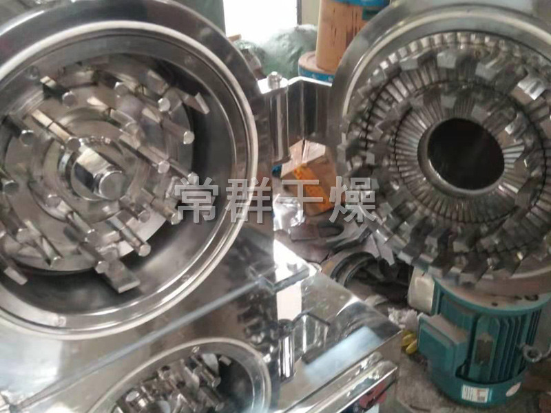 ??物料由進料斗送進粉碎室,經刀刃和刀座的沖擊,旋轉刀和固定刀同時剪切粉碎,由于受到旋轉離心力的作用,物料自動從出口處流出。