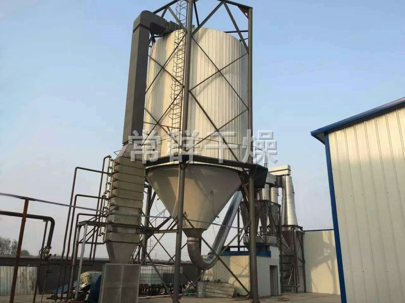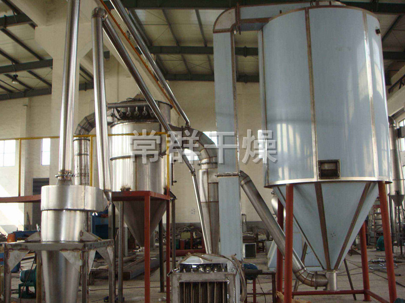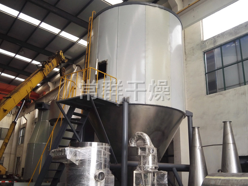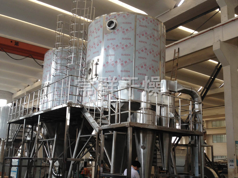 空氣經過濾和加熱,進入干燥器頂部空氣分配器,熱空氣呈螺旋狀均勻地進入干燥室。料液經塔體頂部的高速離心霧化器,(旋轉)噴霧成極細微的霧狀液珠,與熱空氣并流接觸在極短的時間內可干燥為成品。成品連續地由干燥塔底部和旋風分離器中輸出,廢氣由風機排空。